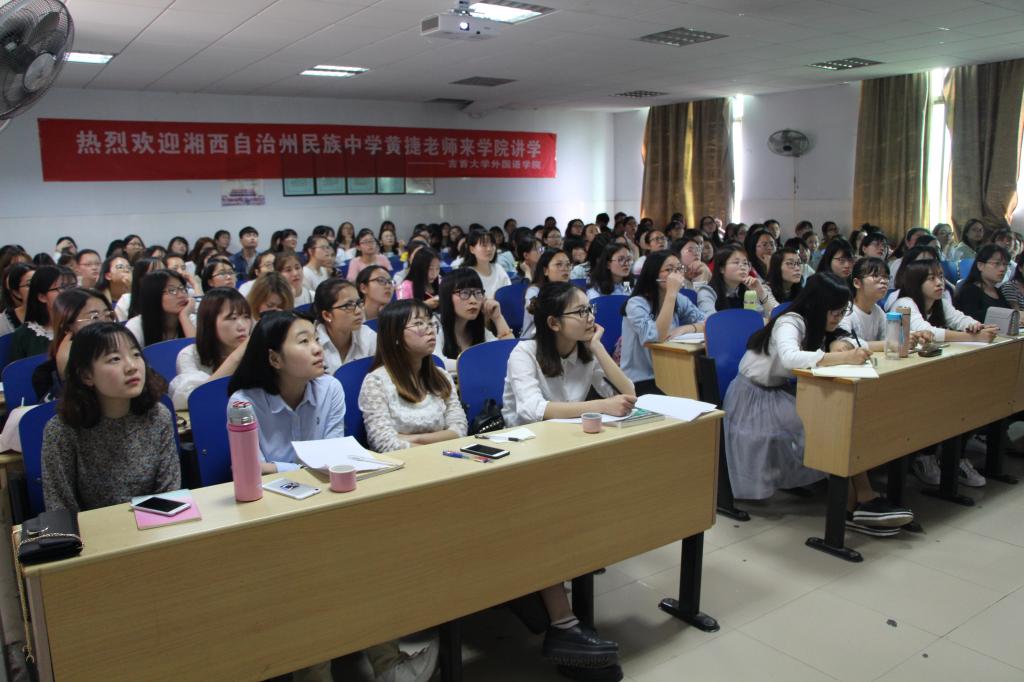 本网讯(通讯员 丁柏顺 龙锐 张丽娜)5月5日下午,逸夫楼3416教室座无虚席。bevictor1946韦德官网特邀湘西自治州民族中学高二年级英语备课组组长黄捷老师来公司讲座。本次讲座由外国语公司党委书记石红梅主持,黄捷老师主讲,公司2014级英语师范班150余人参加。