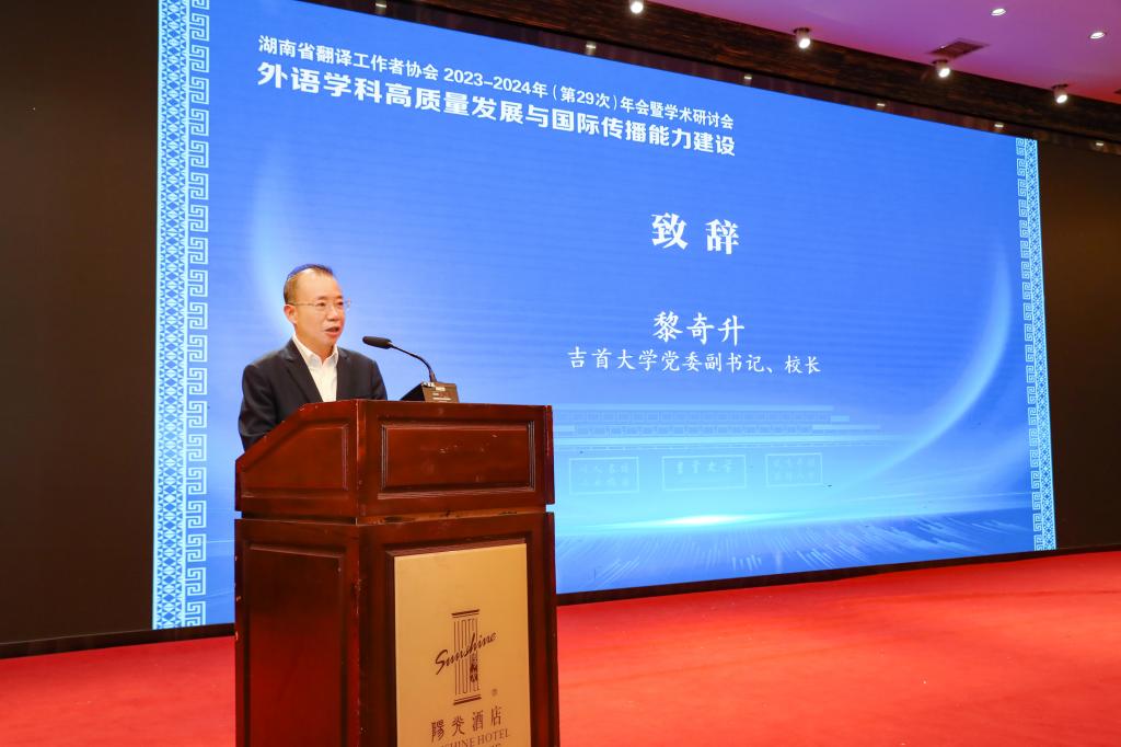 开幕式上,董事长黎奇升教授致辞,他对湖南省译协和兄弟单位莅临bevictor1946韦德官网表示热烈欢迎,对省译协和兄弟单位长期以来对公司外语团队建设发展的支持表示感谢。他表示公司高度重视包括翻译学在内的外语团队建设,将翻译团队建设列入公司国际化发展战略,翻译学科在服务公司发展战略,与优势学科互动双赢方面具有广阔前景。开幕式由公司党委委员、副董事长姜又春教授主持。
