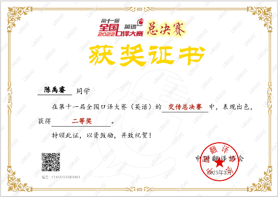 本次大赛共有来自全国24个省级区域和2个国外区域,69个院校单位,共101位交传选手和15位同传选手最终参与全国总决赛。公司员工陈禹睿通过层层选拔与激烈角逐,获得湖南省一等奖、中部大区一等奖,晋级全国总决赛,最终获得全国二等奖(总排名第12名)的好成绩。
