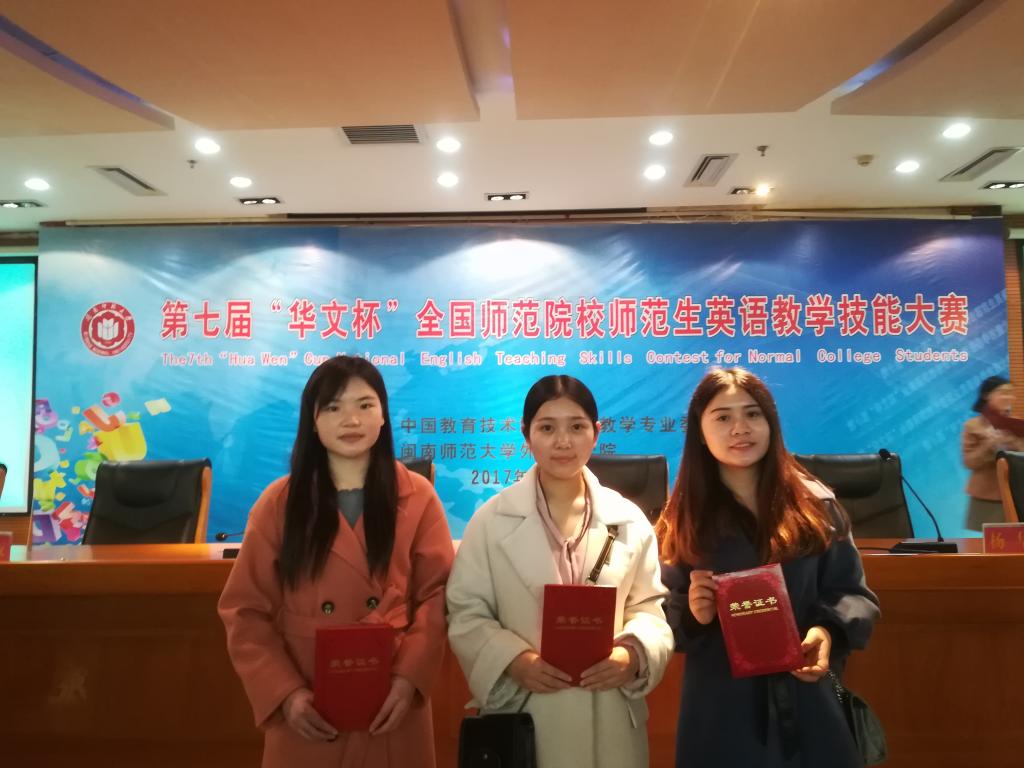 本网讯(修伟)12月30—31日,在福建省漳州市举行的第七届“华文杯”全国师范院校师范生英语教学技能大赛中,公司英语师范生喜获教学技能特等奖1项、二等奖1项、三等奖1项;教学设计二等奖2项、三等奖1项,同时因公司参赛团队成绩优异,荣获组织奖。