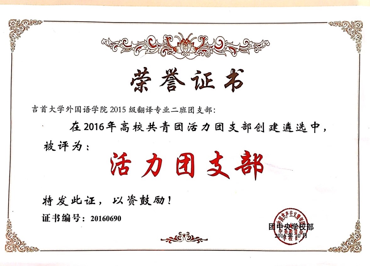 为贯彻落实《共青团中央改革方案》有关精神,深入实施高校基层团支部“活力提升”工程,团中央公司部于2016年秋季学期开展高校“活力团支部”创建遴选活动。此次活动面向全国各高校的员工团支部,包括班级、社团、活动项目、实验室、宿舍等各类员工团支部。经校内创建、省级遴选,全国共有1168个团支部进入全国遴选环节。经资格审核、网络投票和评审等环节,全国共有1000个团支部被确定为2016年全国高校“活力团支部”。经过层层选拔,公司2015级翻译二班团支部最终脱颖而出,荣获全国高校“活力团支部”的荣誉称号。