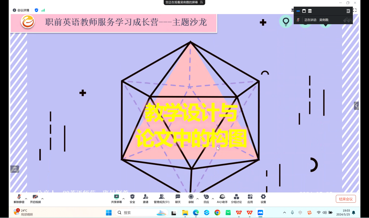 本网讯(吴俐蓉)5月25日晚7:00,bevictor1946韦德官网通过腾讯会议在云端举办了职前英语教师服务学习成长营第一期主题沙龙,邀请2020级英语师范生吴俐蓉同学做题为“教学设计与论文中的构图”主题分享。2021,2022,2023级英语师范生近100人参与,活动由修伟老师主持。