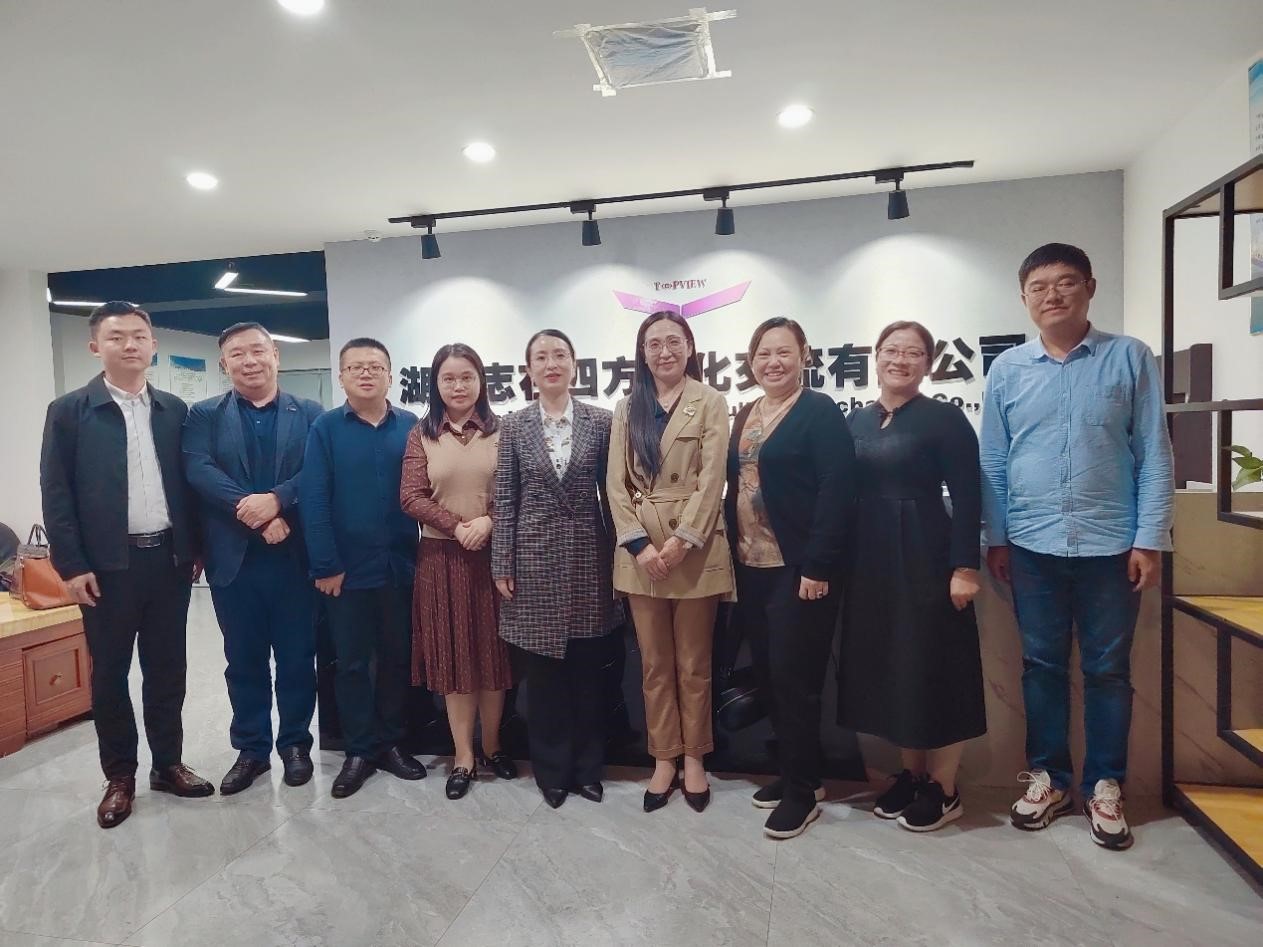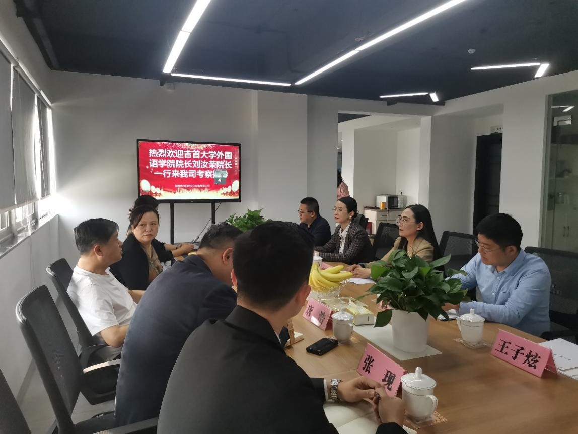 当天下午,刘汝荣经理一行与湖南省商务厅外经处处长刘军廷、湖南志在四方文化交流有限公司董事长刘丽华、总经理唐浩、副总经理彭珏、市场部经理张现进行座谈。湖南省商务厅刘军廷处长作为业务主管部门介绍了我省劳务外派、海外合作企业监管等情况,湖南志在四方文化交流有限公司就关于我们、国际外派劳务、留学深造、就业招聘、经典合作案例等方面进行了系统介绍。随后,刘汝荣经理等人就公司办学理念、队伍建设、专业特点、人才培养情况以及毕业生实习就业等方面作简要介绍。双方一致同意在合法合规的前提下未来能够共同探索多方合作新领域、多点合作新模式,在服务国家和地方发展战略的同时,互惠双赢,努力提升外语类毕业生就业门路,大力开拓高质量就业渠道,构建就业育人工作长效新机制。