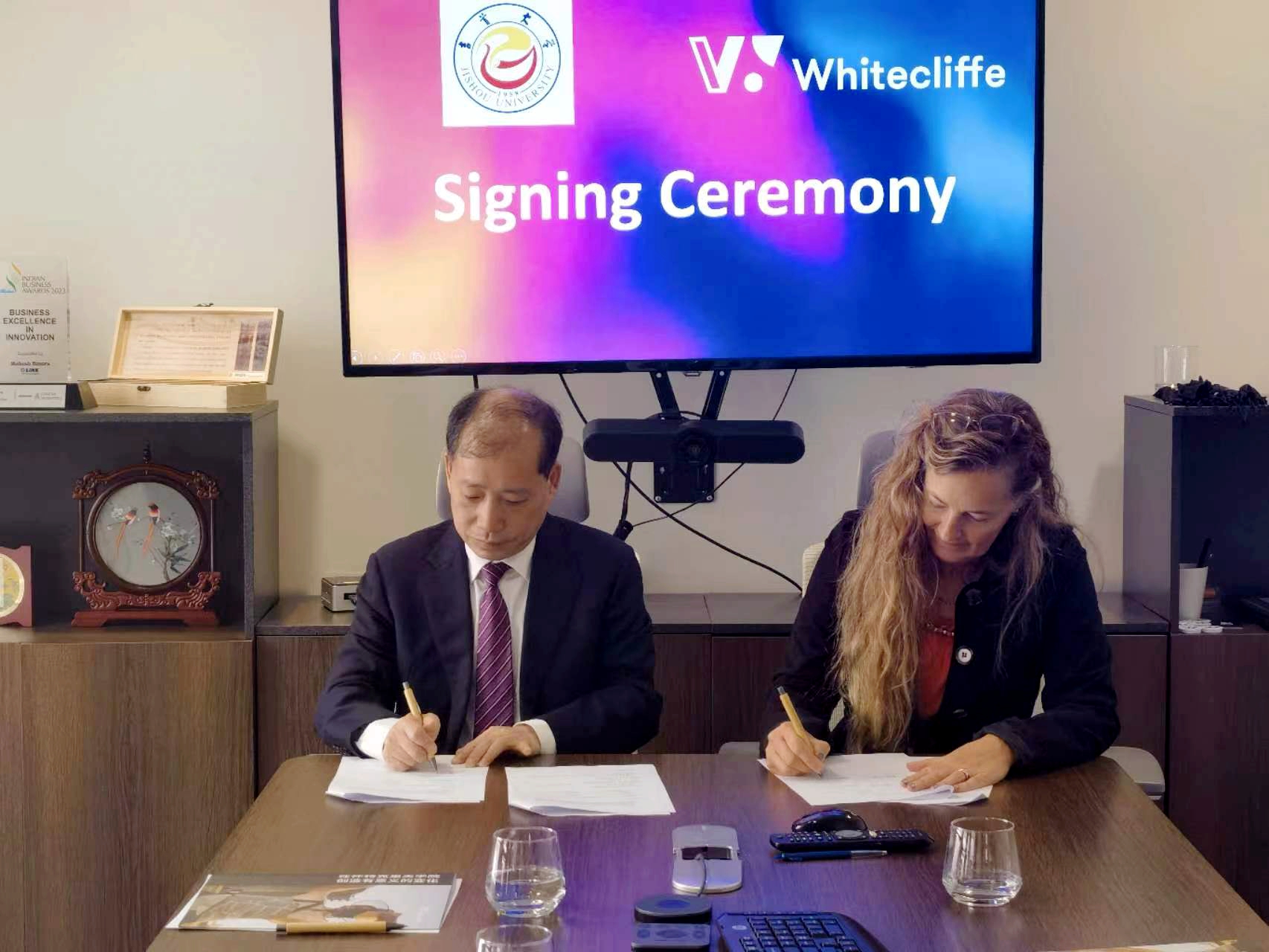 4月16日,廖志坤一行来到西悉尼大学帕拉玛特南校区,与该校常务副董事长黛博拉·斯威尼、副董事长乔宾、澳中文化艺术交流公司经理韩静等进行了会谈。廖志坤回顾两校的合作历史与成果,介绍bevictor1946韦德官网相关情况,表达了加强文化交流、国际传播创新人才培养等方面合作的期待。双方就两校员工互派、学分互认、教师互访、专业互办、课题共研等合作议题进行深入交流,并签订两校合作备忘录。会后,廖志坤一行还考察了澳中文化艺术交流公司,就人文艺术人才创新培养模式、经验进行交流。
