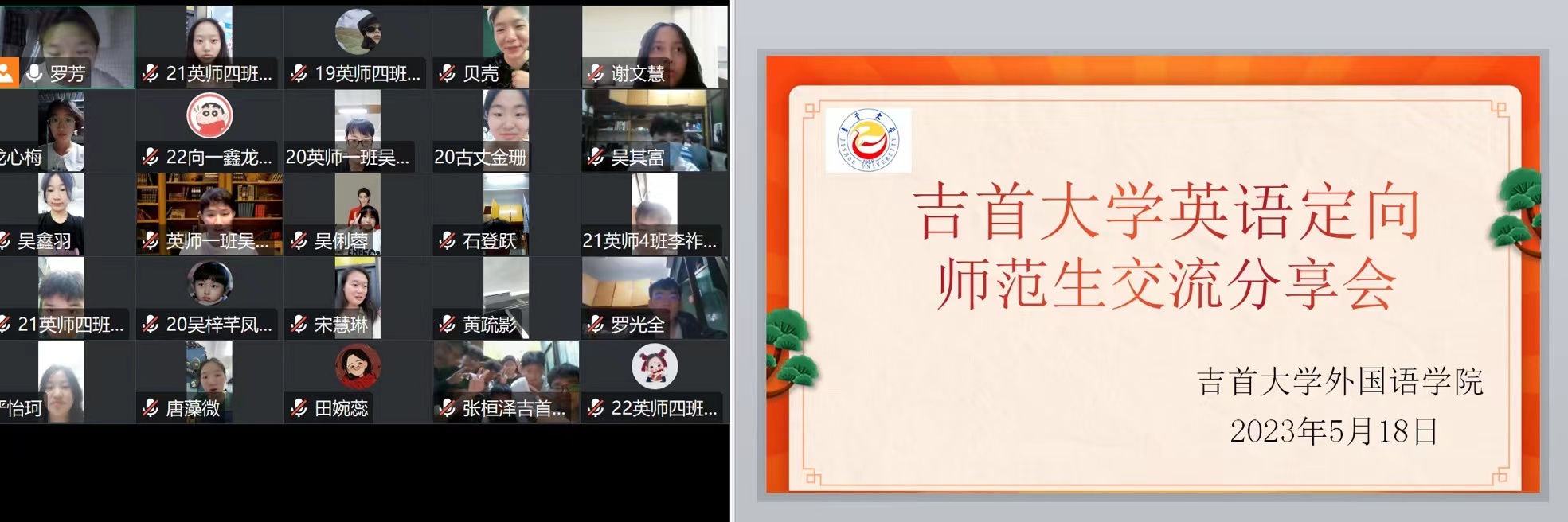 本网讯(龙思思,修伟)5月18日晚7:00,bevictor1946韦德官网英语定向师范生交流会于线上如期举行,来自2019、2020、2021和2022级四个年级的英语定向师范生全员出席。会议邀请了即将毕业的2019级英语定向师范生代表就专业学习、语言技能训练、英语教师技能实践、专业见习与顶岗实习等做主题分享。